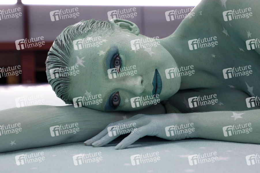 Bodyart-Künstler Jörg Düsterwald realisiert zum Thema 'Vielfältigkeit' mit verschiedenen Fotomodell-Typen eine Kunstwerk-Serie. In den Produktionshallen des kooperierenden Unternehmens Vorwerk flooring in Hameln hat er das schwangere Model Anastasia passend zum gesponserten Bodenbelag mit einem Bodypainting versehen und anschließend flüssige Farbspuren aufgetragen.