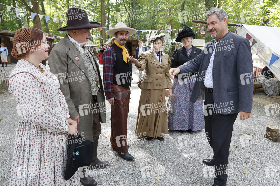 Markus Söder mit Jennifer Schneider (Managerin CCM), Gerhard Lack (Vorsitzender CCM), Rainer Funke (Schriftführer CCM), Helga Lauterbach-Sommer (Tochter des CCM Gründungsmitglieds Hermann Sommer) und Elisabeth Wildegger-Lack (CCM) beim Besuch des Cowboy-Club München 1913 e.V. anlässlich dessen 111-jährigen Jubiläums. München, 11.09.2024