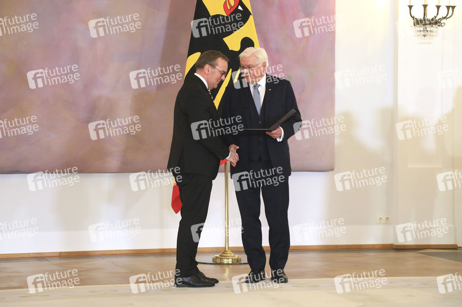 Boris Pistorius und Frank-Walter Steinmeier bei der Entlassung der Bundesregierung des 20. Deutschen Bundestages durch den Bundespräsidenten im Schloss Bellevue. Berlin, 25.03.2025