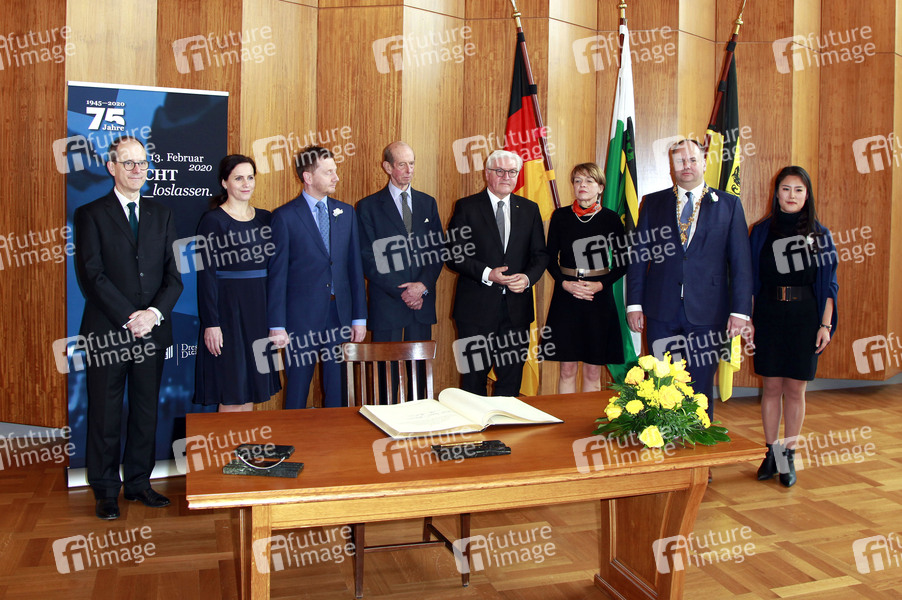 Sebastian Wood, Annett Hofmann, Michael Kretschmer, Prince Edward, 2. Duke of Kent, Frank-Walter Steinmeier, Elke Büdenbender, Dirk Hilbert und Su Yeon Hilbert beim Eintrag des Bundespräsidenten ins Goldene Buch der Stadt Dresden bei einem Empfang zum 75. Jahrestag der Zerstörung Dresdens im Neuen Rathaus. Dresden, 13.02.2020