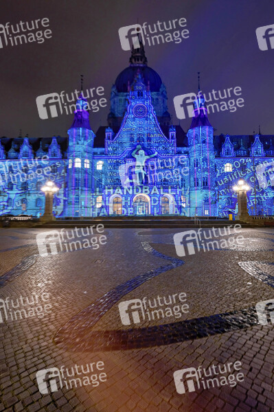 Das Rathaus wird anlässlich Handball-Turniers illuminiert. Am 14., 16. und 17. März kämpfen die Männer-Nationalmannschaften Deutschlands, Österreichs, Kroatiens und Algeriens in einem Turnier in der ZAG Arena um die Qualifikation für die Olympischen Spiele in Paris. Um dieses Ereignis auch in der City sichtbar zu machen, wird das Neue Rathaus am Trammplatz an drei Abenden mit wechselnden und teils bewegten Handball-Motiven illuminiert. Es handelt sich um eine gemeinsame Aktion der Landeshauptstadt Hannover und der Hannover Tourismus GmbH. Hannover, 13.03.2024