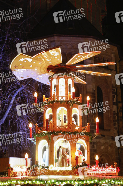 Weihnachtspyramide - Jedes Jahr verwandelt sich die Bonner Innenstadt in eine stimmungsvolle Budenstadt, dem Bonner Weihnachtsmarkt. Kunsthandwerk, Fahrgeschäfte und viele kulinarische Köstlichkeiten machen den Besuch bei gemütlicher Atmosphäre zu einem kleinen Erlebnis. Energiesparmaßnahmen finden sich in der LED-Technik, im begrenzten Zeitraum der Beleuchtungen nur zwischen 16 und 22:00 Uhr sowie beim Verzicht auf Heizpilze. Bonn, 03.12.2022