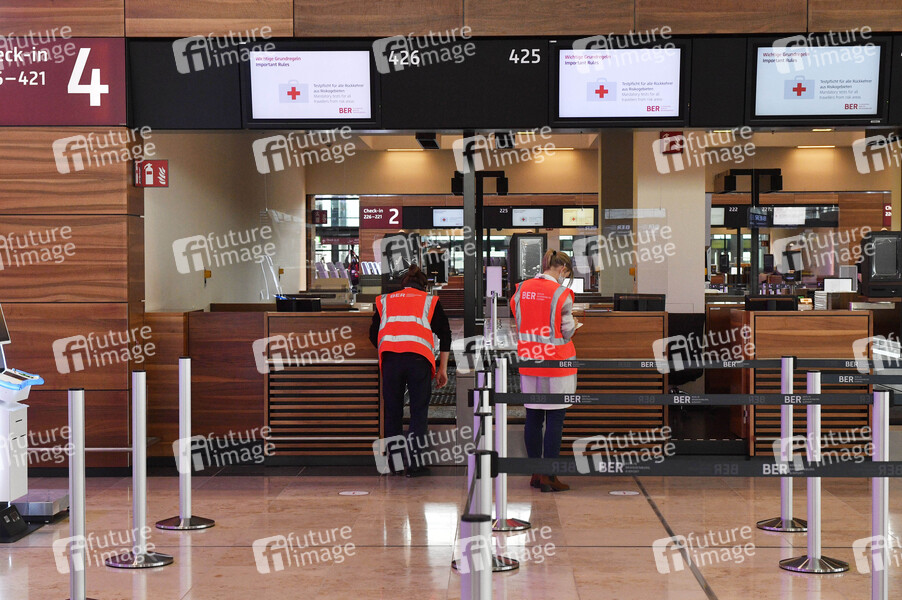 Rundgang durch den öffentlichen Bereich des Terminals 1 mit Check-in-Halle und Besucherterrasse auf dem Flughafen Berlin Brandenburg. Schönefeld, 28.10.2020
