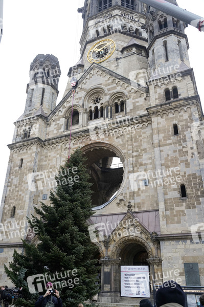 Aufstellung einer 17 Meter hohen Nordmanntanne für den Weihnachtsmarkt auf dem Breitscheidplatz vor der Kaiser-Wilhelm-Gedächtnis-Kirche. Berlin, 02.11.2021