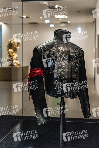 Lederjacke aus den 80ern designed von Michael Jackson bei Eröffnung der Ausstellung 'Michael Jackson: On the Wall' in der Bundeskunst- und Ausstellungshalle. Die Ausstellung untersucht den Einfluss von Michael Jackson auf einige der führenden Persönlichkeiten der zeitgenössischen bildenden Kunst. Sie umfasst mehrere Künstlergenerationen sowie alle Medien. Erstmals werden Werke von über vierzig Künstlern versammelt, die aus öffentlichen und privaten Sammlungen in aller Welt stammen, darunter auch Exponate, die eigens für die Ausstellung geschaffen wurden. Die Ausstellung wurde von der National Portrait Gallery, London, entwickelt und mit der Bundeskunsthalle organisiert in Kooperation mit dem Michael Jackson Estate. Bonn, 20.03.2019