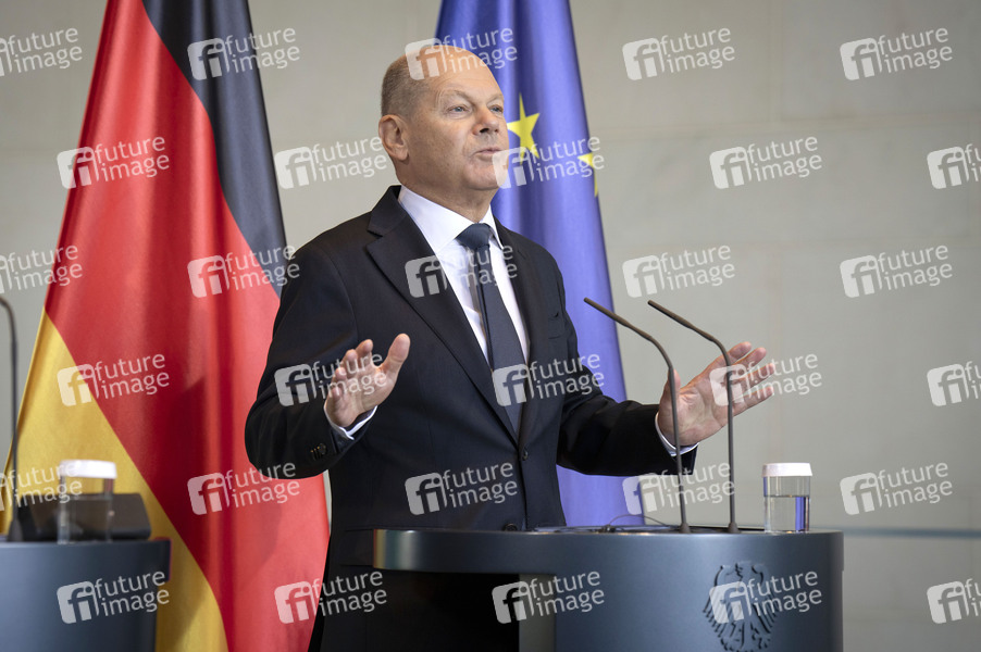 Olaf Scholz beim Empfang des Königs von Jordanien zu einem gemeinsamen Gespräch und anschließendem Pressestatement im Bundeskanzleramt. Berlin, 03.04.2025