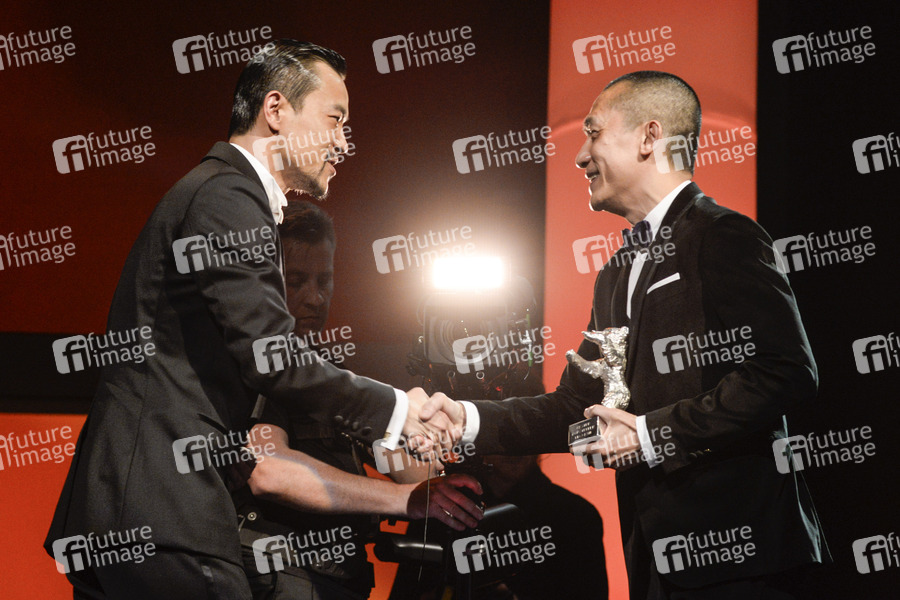 Tony Leung überreicht den Silbernen Bären für den besten Darsteller in 'Bai ri yan huo / Black Coal, Thin Ice' an Liao Fan bei der Closing Ceremony und Preisverleihung auf der Berlinale 2014 / 64. Internationale Filmfestspiele Berlin, 15.02.2014