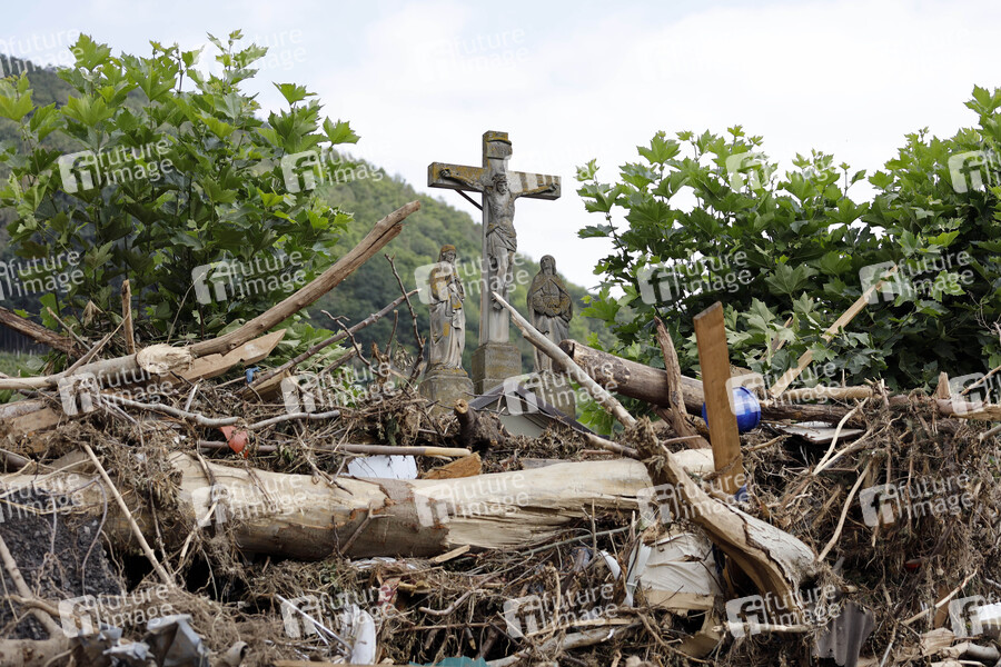 Nach dem Jahrhunderthochwasser in der Eifel durch heftige Regenfälle und Dauerregen mit Überschwemmungen und Überflutungen haben die Aufräumarbeiten im Ahrtal begonnen. Einheiten von Polizei, THW, Bundeswehr und Feuerwehr mitsamt vielen freiwilligen Helfern räumen Straßen, entfernen Schutt und Schlamm und versorgen die Menschen. Im Bild ein unbeschädigtes Kruzifix in der Ortschaft Rech, in der die Flut viele Häuser zerstörte, 22.07.2021