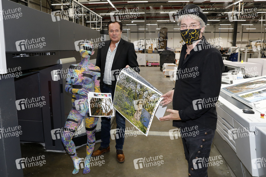 Jörg Düsterwald mit Model Lisa und QUBUSmedia Geschäftsführer Thomas Quensen mit Kalender-Titelseite - Jörg Düsterwald, einer der bekanntesten Bodypainting- und Bodyartkünstler Deutschlands macht auf seine ganz eigene Art auf die prekäre Situation freischaffender Künstler während der Corona-Pandemie aufmerksam: Unter dem Hashtag #WirzeigenFarbe hat der Hamelner Künstler in der Produktionshalle der Druckerei QUBUS media mit seinem Model Lisa ein ausdruckstarkes Live-Bodypainting inszeniert - denn Künstlerinnen und Künstler wie er sehen und fühlen sich derzeit wortwörtlich 'ausgezogen bis aufs letzte Hemd'. Und nichts symbolisiert diesen bekannten Spruch besser als ein Bodypainting auf nackter Haut in einer Umgebung, in der es jeden Tag um Farbe geht. Die Live-Performance fand mit dem zeitgleichen Druckstart von Jörg Düsterwald's neuem Premiumkalender 'Bodypainting in Nature 2021' statt. Hannover, 14.07.2020