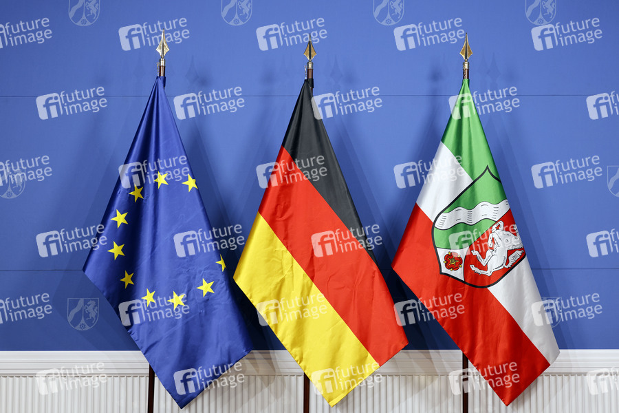 NRW-Ministerpräsident Hendrik Wüst empfängt Sternsingerinnen und Sternsinger zum traditionellen Dreikönigssingen aus den umliegenden Bistümern und nimmt ihren Segen entgegen in der Staatskanzlei Düsseldorf. Im Bild nebeneinander die EU-Flagge, die Nationalflagge der Bundesrepublik Deutschland sowie die Landesflagge mit den Landesfarben und dem Landeswappen des deutschen Bundeslandes Nordrhein-Westfalen. Düsseldorf, 01.06.2022