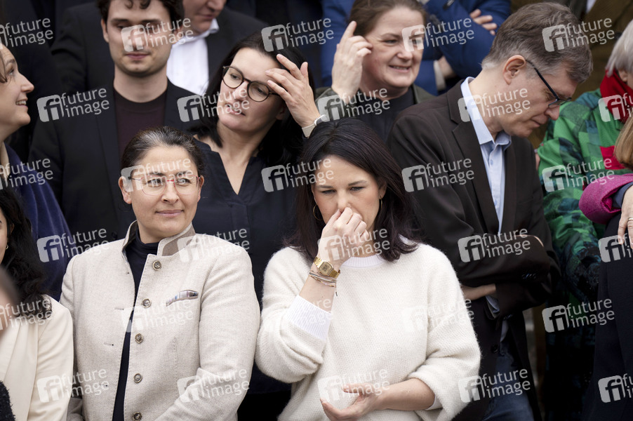 Annalena Baerbock beim Gruppenfoto der neuen Bündnis 90/Die Grünen Fraktion nach der Fraktionssitzung der Bündnis 90/Die Grünen-Bundestagsfraktion auf der Treppe zum Reichstagsgebäude. Berlin, 26.02.2025