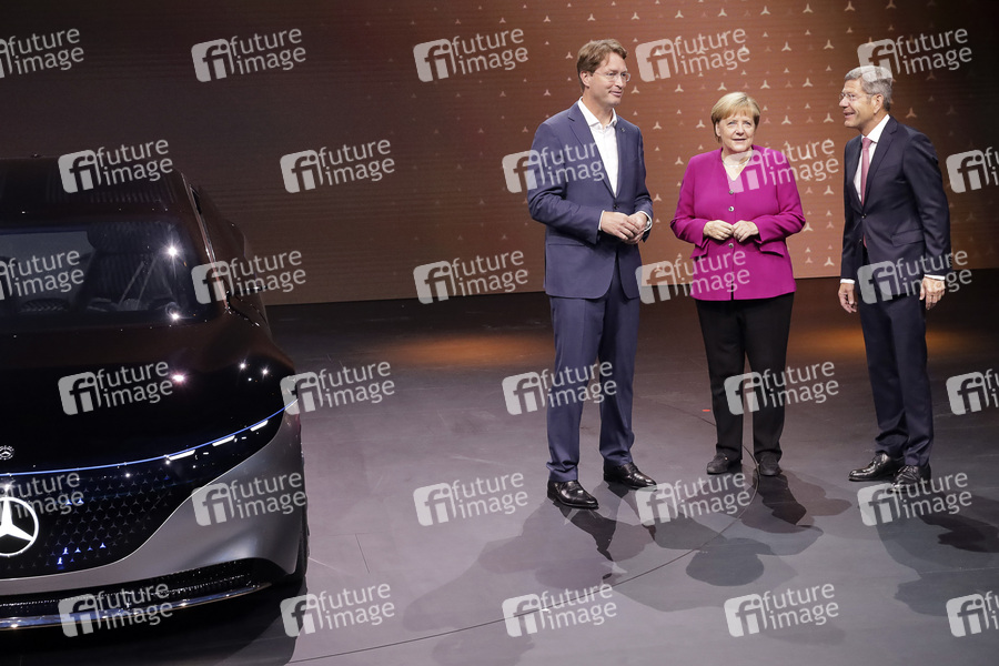 Ola Källenius, Angela Merkel und Bernhard Mattes beim Eröffnungsrundgang auf der Internationalen Automobil-Ausstellung 2019 auf dem Messegelände. Frankfurt am Main, 12.09.2019