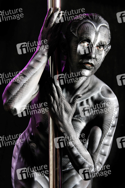 Bodypainting, Erotik, Frau, nackt, drinnen, weiblich, Monster, Außerirdische, Alien, Echse, Körperkunst, Kunst, Malerei, monochrom, erotic, woman, nude, indoor, female, monochrome, lizard, body art, body painting