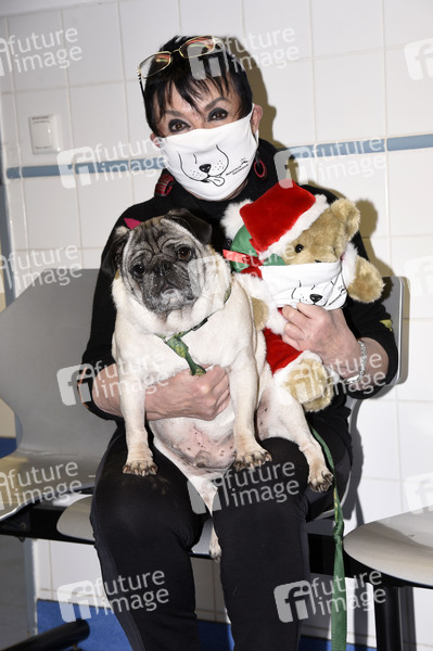 Uschi Ackermann mit Hund Willy beim Fototermin zur Masken- und Gondelspende in der Medizinischen Kleintierklinik der Ludwig-Maximilians-Universität (LMU). Uschi Ackermann hat ihren Mops Willi in der Medizinischen Kleintierklinik in Behandlung. Uschi Ackermann trägt eine Maske, mit cooler Hunde-Illu und dem Klinik-Logo. Sie hat der Klinik 100 tierisch bedruckte Stoffmasken gespendet. München, 21.12.2020