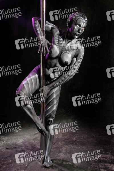 Bodypainting, Erotik, Frau, nackt, drinnen, weiblich, Monster, Außerirdische, Alien, Echse, Körperkunst, Kunst, Malerei, monochrom, erotic, woman, nude, indoor, female, monochrome, lizard, body art, body painting