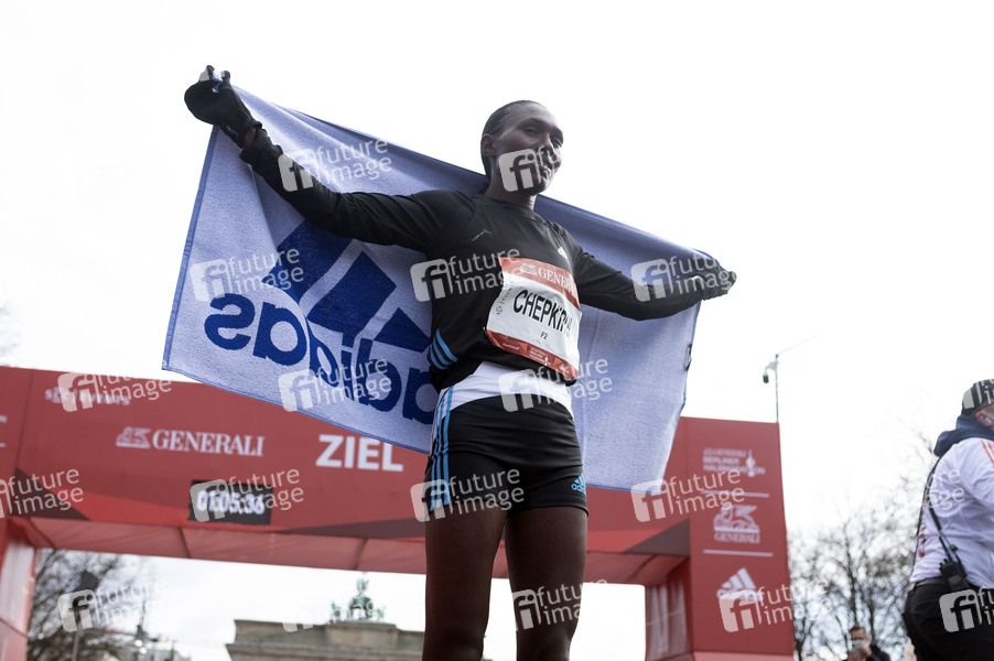 Die Siegerin Sheila Chepkirui Kiprotich beim Zieleinlauf vom 41. Berliner Halbmarathon 2022. Berlin, 03.04.2022