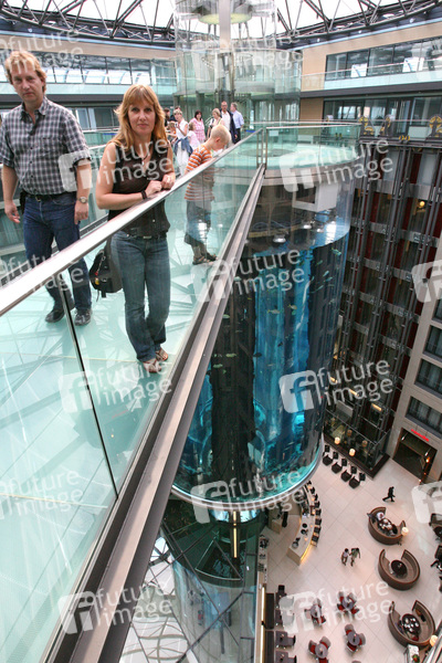 Ein Fahrstuhl fährt in etwa fünf Minuten mitten durch eine 25 m hohe Aquariumssäule in der Hotelhalle, das größte Zylinderaquarium der Welt, eine Million Liter mit 2700 Fischen, 2000 Tonnen Gewicht auf 6 qm Standfläche, 22 cm dicke Acrylscheiben, Lippfische, Doktorfische, Kaiserfische, Bodenguckermakrelen, Sägebarsche