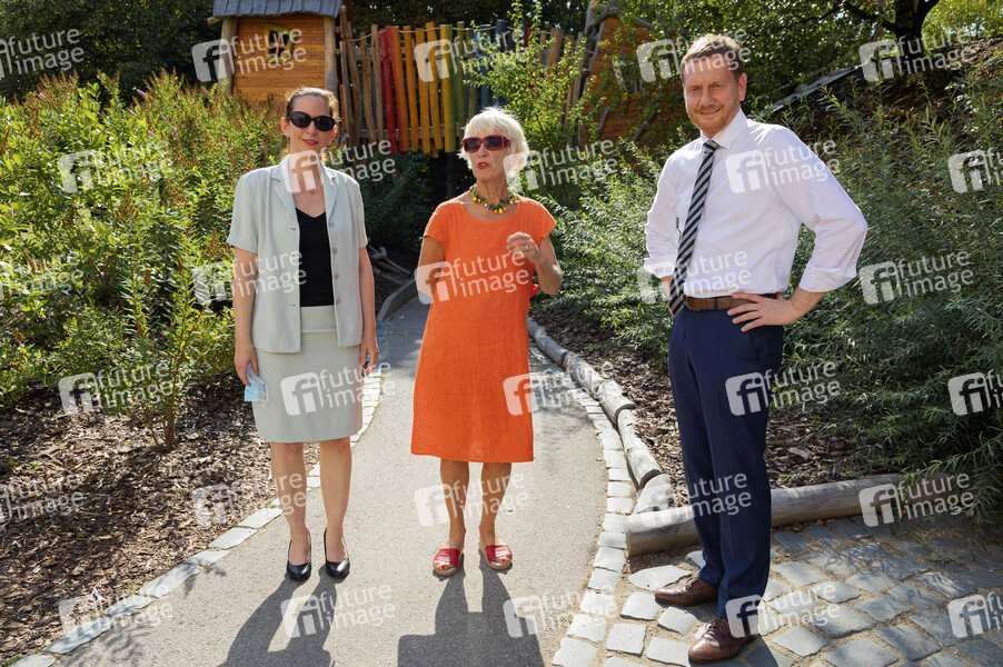 Ivet Lopez, Monika Ehrhardt-Lakomy und Michael Kretschmer bei der Eröffnung des ersten bundesweiten Traumzaubergartens nach Motiven aus dem 'Traumzauberbaum' von Reinhard Lakomy in der DRK-Kindertagesstätte 'Findikus'. Bautzen, 12.08.2020