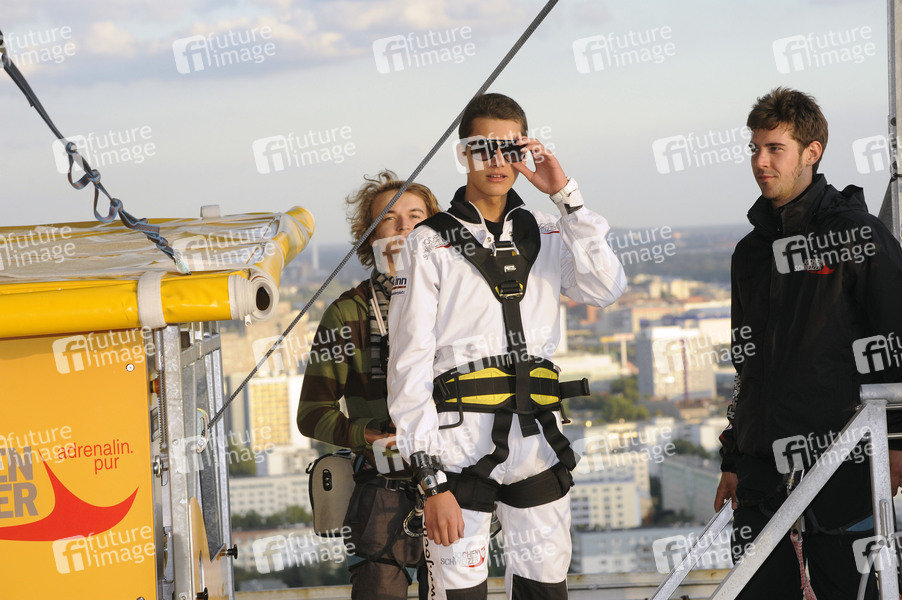 Base Flying von Jochen Schweizer mit den Hauptdarstellern von 'Gangs' auf dem Park Inn Hotel am Alexanderplatz in Berlin