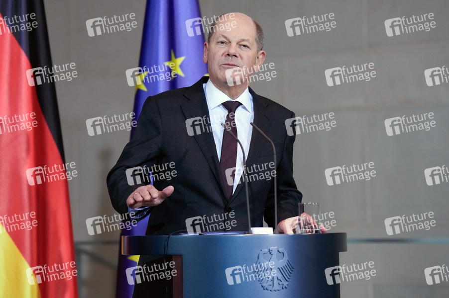 Olaf Scholz beim Empfang des Ministerpräsidenten der Republik Polen mit militärischen Ehren zu einem gemeinsamen Gespräch mit dem Bundeskanzler und anschließendem Pressestatement im Bundeskanzleramt. Berlin, 12.02.2024