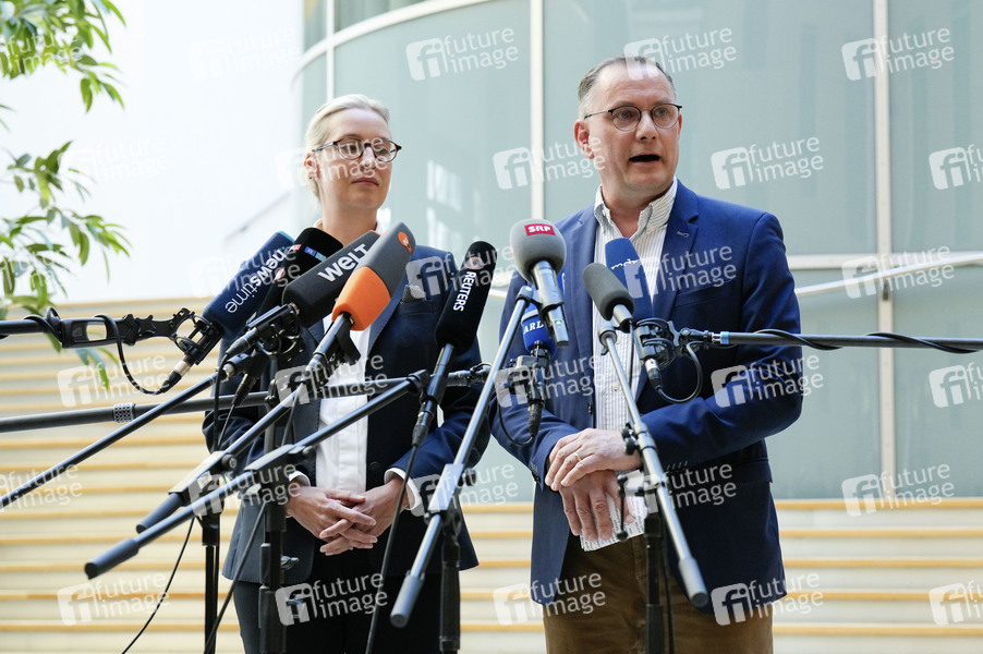 Alice Weidel und Tino Chrupalla beim Statement der AfD-Fraktionsspitze zum Urteil des nordrhein-westfälischen Oberverwaltungsgerichts betreffs der Einstufung der AfD als rechtsextremistischen Verdachtsfall. Berlin, 13.05.2024