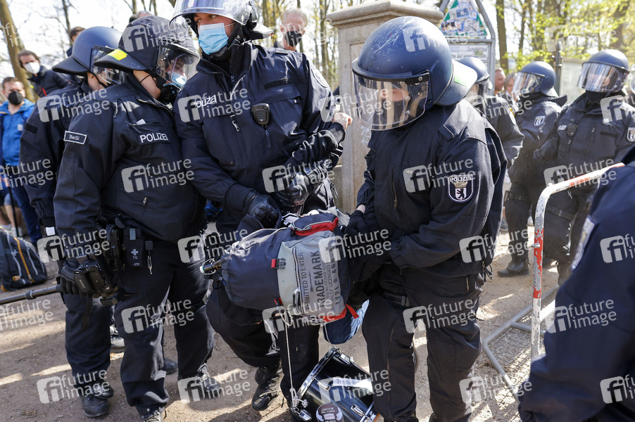 Tausende Demonstranten haben sich am Mittwoch auf der Straße des 17. Juni versammelt, um gegen die staatliche Corona-Politik zu protestieren. Wegen vielfacher Verstöße gegen die Corona-Auflagen wurde die Demo von der Polizei aufgelöst. Berlin, 21.04.2021