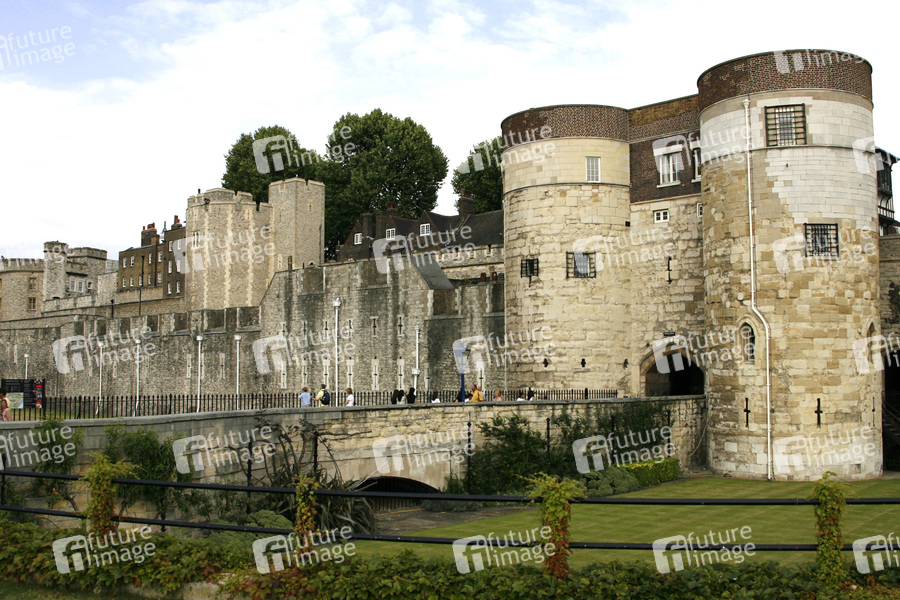 im Mittelalter errichteter Komplex aus mehreren befestigten Gebäuden entlang der Themse, Festung, Palast, Gefängnis, UNESCO Weltkulturerbe, heute werden im Tower die britischen Kronjuwelen aufbewahrt