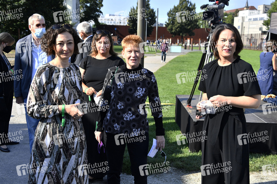 Ramona Pop, Petra Pau und Annalena Baerbock bei der zentralen Gedenkveranstaltung zum 60. Jahrestag des Mauerbaus auf dem Vorplatz der Kapelle der Versöhnung an der Gedenkstätte Berliner Mauer an der Bernauer Straße. Berlin, 13.08.2021