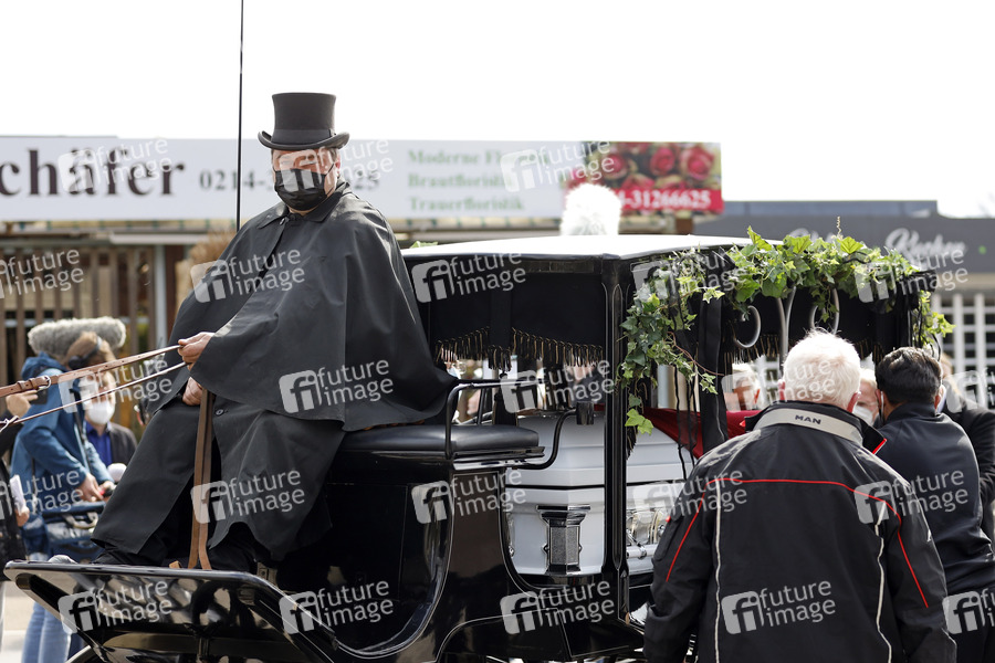 Die Stadt Leverkusen befürchtete eine größere Menschenansammlung bei der Beerdigung eines hochrangigen Clan-Mitglieds einer Großfamilie und damit Verstöße gegen die Corona-Schutzverordnung. Der Sarg wurde auf eine Kutsche geladen und in den Friedhof gefahren. Leverkusen, 09.04.2021