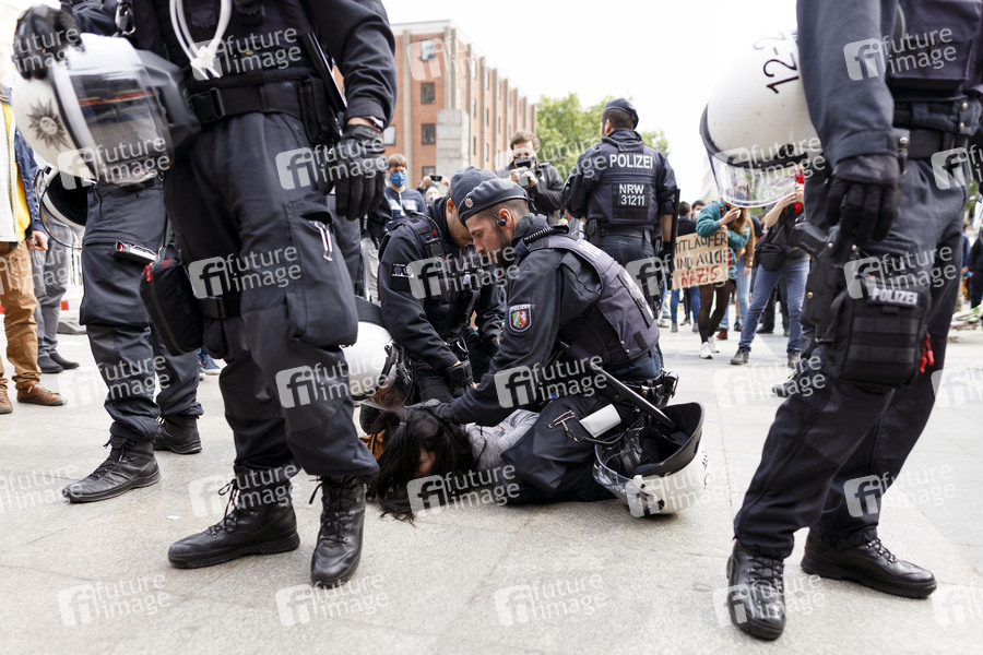 Die Youtuberin Lisa Licentia wird am Rande der Demonstrationen des Bündnis Köln gegen Rechts und Gegner der Corona-Maßnahmen auf dem Roncalliplatz von der Polizei zu Boden gebracht. Köln, 16.05.2020