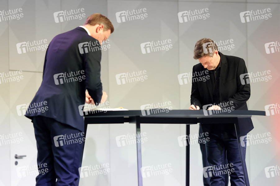 Christian Lindner und Robert Habeck beim Pressetermin zur Unterzeichnung des Koalitionsvertrages zwischen SPD, Bündnis 90/Die Grünen und FDP im Futurium. Berlin, 07.12.2021