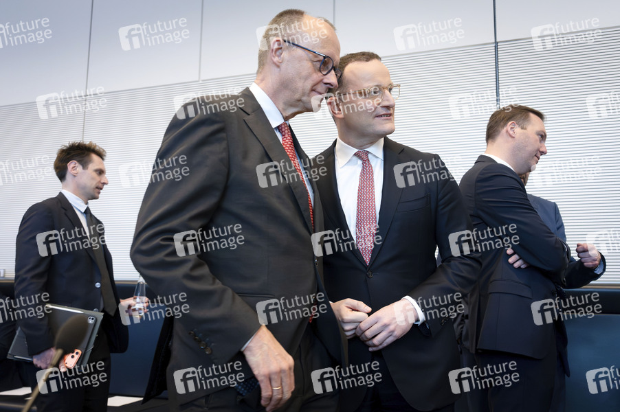 Friedrich Merz und Jens Spahn in der Fraktionssitzung der CDU/CSU-Bundestagsfraktion im Reichstagsgebäude. Berlin, 17.03.2026