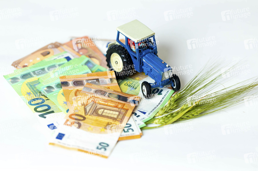 Landwirt, Landwirte, Bauer, Bauer, Subventionen, Unterstützung, Agrarsubventionen, Kompensation, Investitionsunterstützungen, garantierte Abnahmepreise, Nahrungsmittel, Agrikultur, Agrarwesen, Tierhaltung, Agrarprodukte, Tierprodukte, landwirtschaftlichen Nutzfläche, Agrarökologie, nachhaltige Landwirtschaft, Geld, Banknoten, Geldscheine, Euro, €, Geldscheine, Trecker, Traktor, Gerste, Getreide, Agrardiesel, Symbolbild, Themenbild
