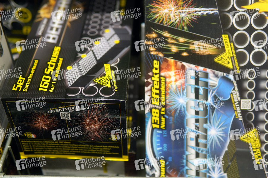 Ab Samstag den 28.12. ist der Verkauf von Feuerwerkskörpern 2024 erlaubt. Auch dieses Jahr wird eine große Nachfrage erwartet. Im Bild Feuerwerk in einem Supermarkt. (Symbolfoto, Themenfoto) Berlin, 28.12.2024