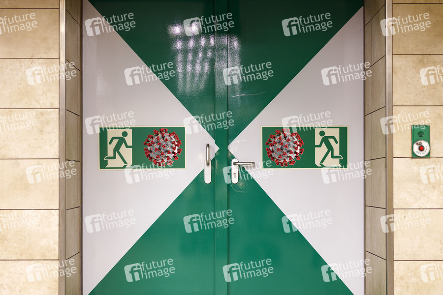 Ein Notausgang-Schild mit einer Grafik des Coronavirus des CDC symbolisiert das Ringen um eine Exit-Strategie der Bundesregierung aus der Coronakrise