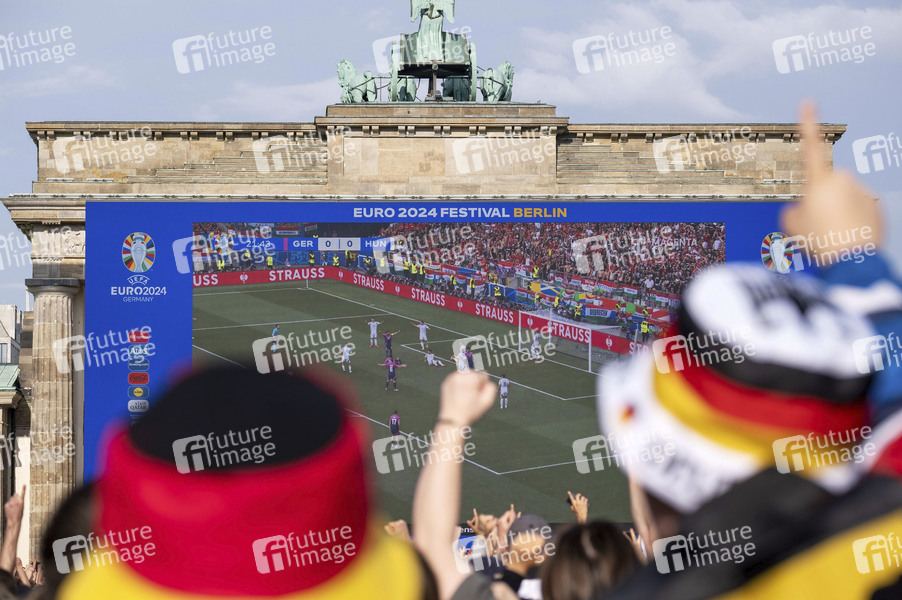 Deutsche Fußballfans feiern auf der Berliner Fanzone am Brandenburger Tor anlässlich des Fußballspiels Deutschland gegen Ungarn während der UEFA EURO 2024. Berlin, 19.06.2024