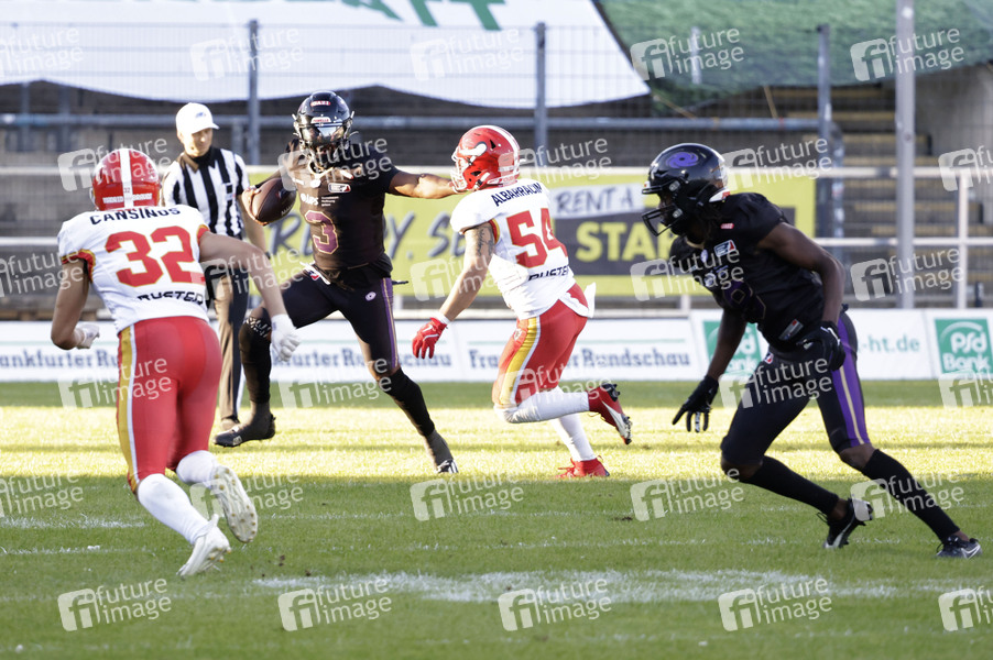 Alvaro Cansinos (32), Matthew McKay (3), Victor Albarracin (54) und Brandon Butler (8) beim American Football-Spiel Frankfurt Galaxy gegen Madrid Bravos in der PSD Bank Arena Frankfurt. Frankfurt am Main, 10.08.2024