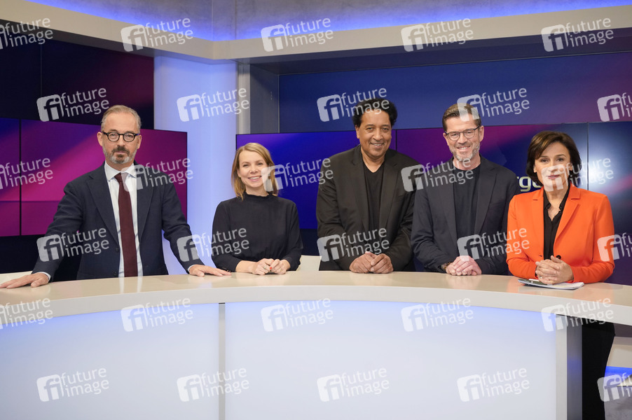 Jan Fleischhauer, Helene Bubrowski, Cherno Jobatey, Karl-Theodor zu Guttenberg undSandra Maischberger in der ARD-Talkshow 'maischberger' im Studio Berlin Adlershof. Berlin, 21.01.2025