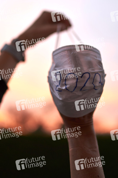 Symbolische Verabschiedung des Jahres 2020 - Mund-Nasen-Bedeckung mit Jahreszahl vor einem Sonnenaufgang zum Abschuß zwischen den Händen gespannt. (Symbolbild, Themenbild) Hannover, 31.12.2020