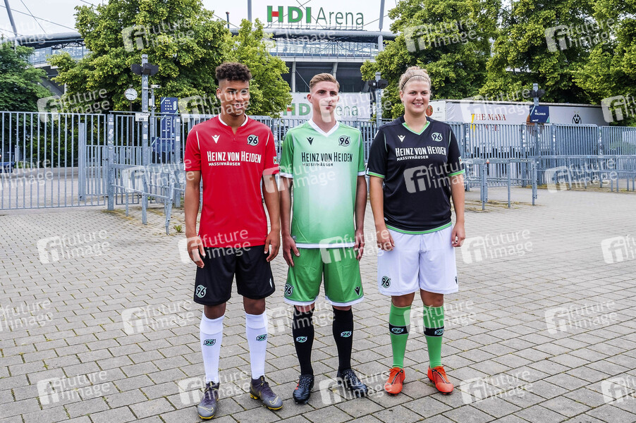 Linton Maina, Niklas Tarnat und Anna-Lena Füllkrug bei der Präsentation der Hannover 96-Trikots des neuen Ausrüsters Macron für die Saison 2019/20 in der HDI Arena. Hannover, 16.06.2019