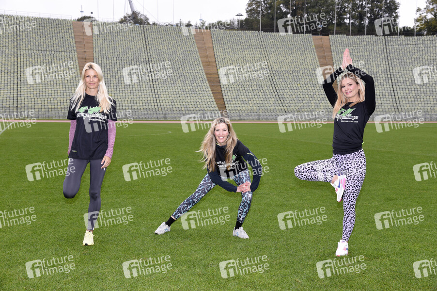 Tina Kaiser, Viola Weiss und Karolin Kandler beim Fototermin zur sportichen '#WocheChallenge' im Olympiastation München. Unter dem Motto 'Wir können was bewegen!' ruft die Welthungerhilfe zu dieser Challenge auf und bittet um Spenden für eine Welt ohne Hunger. München, 13.10.2020