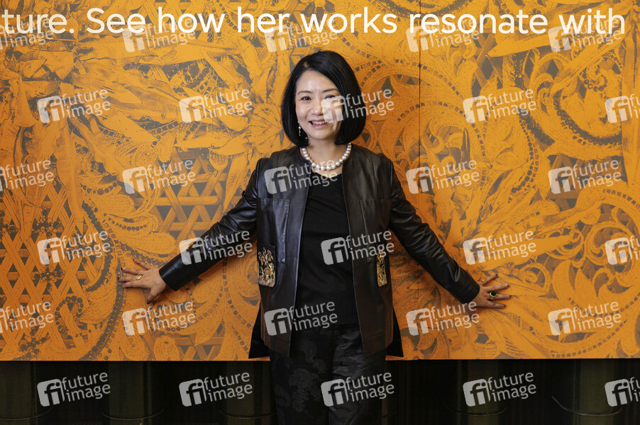 Guo Pei bei ihrer Ausstellung in der M+ Gallery in Hongkong. Die Ausstellung dauert bis April 2025. Guo Pei ist die renommierte chinesische Haute-Couture-Designerin, die für ihre komplizierten, opulenten Designs gefeiert wird, die traditionelle chinesische Handwerkskunst nahtlos mit moderner Mode verbinden. Bekannt für ihre atemberaubend detailreichen Kreationen, darunter das ikonische gelbe Kleid, das Rihanna bei der Met Gala 2015 trug, wurde Guo Pei 2010 das erste asiatische Mitglied der Chambre Syndicale de la Haute Couture und festigte damit ihren Platz auf der globalen Modebühne. Hongkong, 21.09.2024