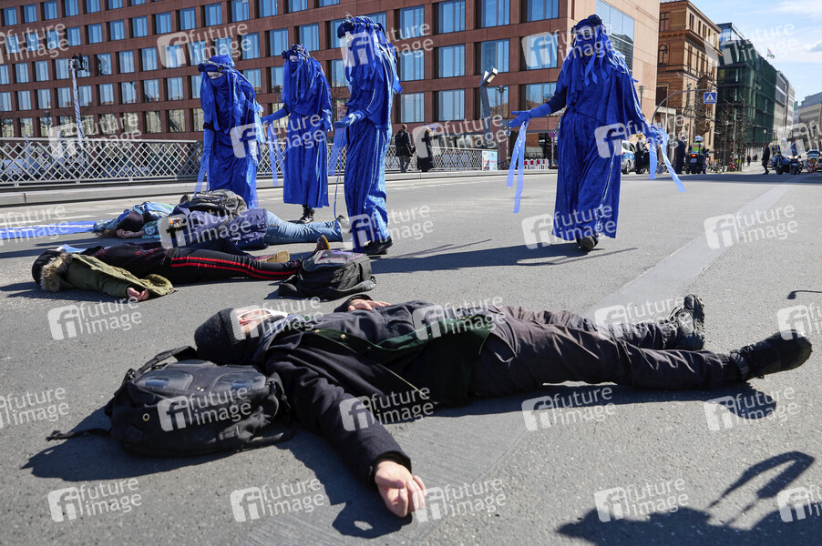 Klimaaktivisten von Extinction Rebellion protestieren in Berlin-Mitte zum Weltwassertag gegen eine zunehmende Verseuchung des Trinkwasser u.a. durch Fracking und gegen eine durch Großkonzerne erzeugte Wasserknappheit. Berlin, 22.03.2021