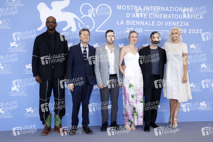 RaMell Ross, Pietrangelo Buttafuoco, Fernando Enrique Juan Lima, Shannon Murphy, Yuri Ancarani und Julia Ducournau beim Photocall mit der Orizzonti Jury auf der Biennale di Venezia 2025 / 82. Internationale Filmfestspiele von Venedig im Palazzo del Casino. Venedig, 27.08.2025