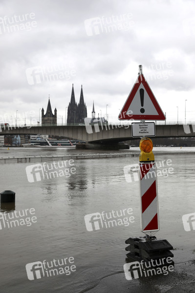 Reinhochwasser, Rheinpegel, Fluss, Rhein, Pegelstand, Pegel, Hochwasser, Pegelmarke, Hochwassermarke, Hochwasserwelle, Scheitelpunkt, Rhein-Pegel, Flussbett, Flut, Schifffahrt, Hochwasserschutz, Wasserstand, Mittelwasser, Tauwetter, Rheinschifffahrt, Rheinufer, Rhein-Ufer, Hochwasserschutzzentrale, Hochwasserwelle, Pegel-Nullpunkt, Hochwasserlage, Hochwassermeldedienst, Hochwasserinformationsdienst, Wasserstände, Pegelstände, Wetterlage, ansteigendes Wasser, steigender Pegel, unter Wasser, überflutet, Rheinufer, Schmelzwasser, Wetter, Scheitelpunkt, kritische Marke, Hochwassermarke, Kölner Dom, Deutz, Symbolbild, Symbolfoto