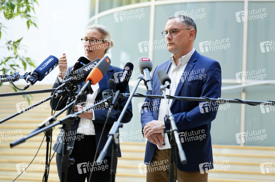 Alice Weidel und Tino Chrupalla beim Statement der AfD-Fraktionsspitze zum Urteil des nordrhein-westfälischen Oberverwaltungsgerichts betreffs der Einstufung der AfD als rechtsextremistischen Verdachtsfall. Berlin, 13.05.2024