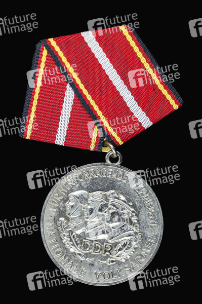 DDR Verdienstmedaille der Nationalen Volksarmee - Orden und Ehrenzeichen sind Auszeichnungen in Form tragbarer Abzeichen, die von staatlichen oder staatlich autorisierten Stellen als Belohnung für geleistete Dienste oder vorbildliches Verhalten verliehen werden, sowie um sich die Loyalität der auszuzeichnenden Person zu sichern. (Symbolfoto, Thememfoto)