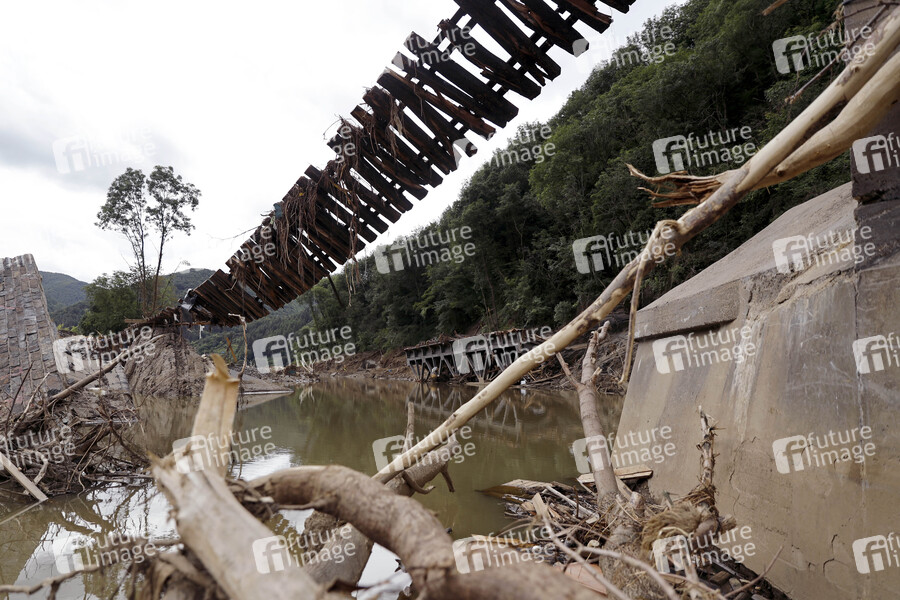 Nach dem Jahrhunderthochwasser in der Eifel durch heftige Regenfälle und Dauerregen mit Überschwemmungen und Überflutungen haben die Aufräumarbeiten im Ahrtal große Fortschritte gemacht. Einheiten von Polizei, THW, Bundeswehr und Feuerwehr mitsamt vielen freiwilligen Helfern haben Straßen geräumt, Schutt und Schlamm entfernt und die Menschen versorgt. Der Wiederaufbau wird trotzdem Jahre dauern. Im Bild Flutschäden an einer Brücke zwischen Rech und Mayschoß, die durch die Flut beschädigt wurde, 08.08.2021