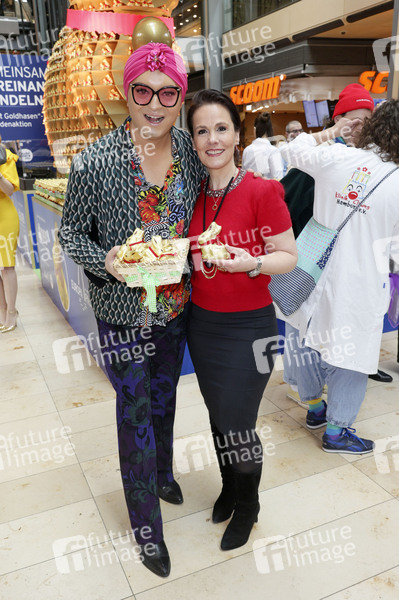 Julian F. M. Stoeckel und Manuela Görlitz beim Charity Verkauf von Lindt Osterhasen zu Gunsten der Hamburger Tafel e.V. und der Budnianer Stiftung in der Europa Passage. Hamburg, 14.03.2024