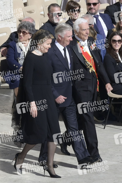 Mathilde, Königin der Belgier und Philippe, König der Belgier bei der Trauermesse für den verstorbenen Papst Franziskus auf dem Petersplatz. Vatikanstadt, 26.04.2025